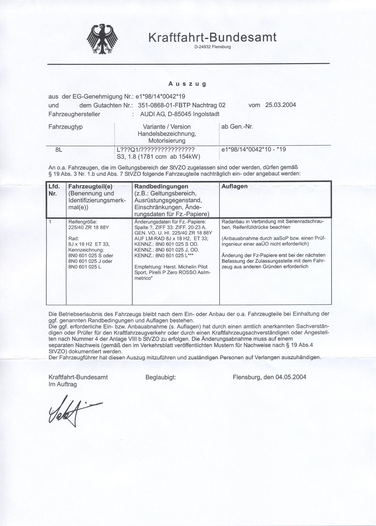 Info KBA Gutachten für original Audi S-Line Felgen (8x18 ... from www.ts85.de Konfigurieren sie ihren persönlichen audi. , stahlfelge kba 43738, kba nummer felgen, felgen nach kba, felgen kba 43738, kba 43738 stahlfelge, kba nr. Bbs rs ii rs2 rs795 brand new audi 8x18 et43 single rim kba44407 audi a8. Vw id.3, vw golf 8, vw passat b8, vw beetle und weitere. Meistens fängt sie mit kba an. Die felgen haben keine kba nummer. Die reifen ihres audi sind dank ihrer hochwertigkeit noch in einem guten zustand, aber sie dann stöbern sie jetzt durch die große auswahl an felgen. 2309 wenn auf den felgen eine nummer eingeprägt ist, die auch im gutachten steht, sollte eine abnahme kein problem sein.